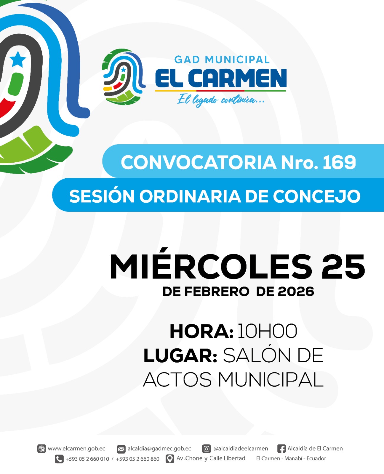 POR DISPOSICIÓN DE LA ING. MAYRA ALEJANDRA CRUZ GARCÍA, ALCALDESA DEL CANTÓN EL CARMEN, DE CONFORMIDAD A LO DISPUESTO EN EL ART. 60 LITERAL C); Y, ART. 318 DEL COOTAD, ME PERMITO CONVOCAR AL VICEALCALDE ING. VÉLEZ ZAMBRANO CRISTÓBAL SALOMÓN, A LAS Y LOS CONCEJALES: TLGO. ÁLAVA LOOR HENRY NICANOR, ARQ. ANDRADE ESTRELLA JESÚS MARINA, LIC. CABRERA GARCÍA SOLANDA INDELIRA, ING. FERRÍN ZAMBRANO MARÍA FERNANDA, ABG. GARCÍA ZAMBRANO RAMÓN IGNACIO, LIC. MEDRANDA SALTOS IVÁN IRALDITO, DRA. MENDOZA GILER TANIA DEL CARMEN Y TLGO. MOREIRA ZAMBRANO DAIRI DISNEY, A SESIÓN ORDINARIA DEL CONCEJO CANTONAL DEL GOBIERNO AUTÓNOMO DESCENTRALIZADO MUNICIPAL, A REALIZARSE EL DÍA MIÉRCOLES 25 DE FEBRERO DEL 2026, A LAS 10H00, EN EL SALÓN DE ACTOS DE LA ENTIDAD MUNICIPAL, UBICADO EN LA AV. CHONE Y CALLE LIBERTAD DE ESTA CIUDAD. SESIÓN CONVOCADA PARA TRATAR EL SIGUIENTE ORDEN DEL DÍA: