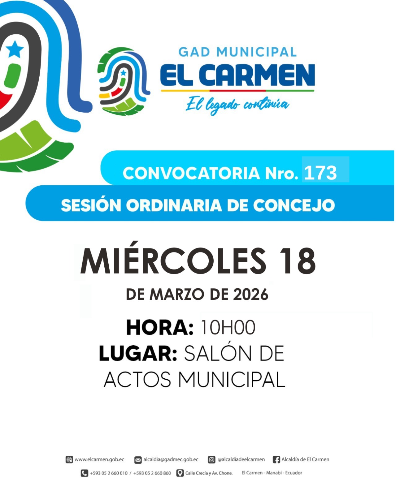 POR DISPOSICIÓN DE LA ING. MAYRA ALEJANDRA CRUZ GARCÍA, ALCALDESA DEL CANTÓN EL CARMEN, DE CONFORMIDAD A LO DISPUESTO EN EL ART. 60 LITERAL C); Y, ART. 318 DEL COOTAD, ME PERMITO CONVOCAR A LAS Y LOS CONCEJALES: TLGO. ÁLAVA LOOR HENRY NICANOR, ARQ. ANDRADE ESTRELLA JESÚS MARINA, LIC. CABRERA GARCÍA SOLANDA INDELIRA, ING. CEDEÑO PÁRRAGA SANDY GEMA, SR. CEVALLOS HERNÁNDEZ PEDRO PABLO, ING. FERRÍN ZAMBRANO MARÍA FERNANDA, ABG. GARCÍA ZAMBRANO RAMÓN IGNACIO, LIC. MEDRANDA SALTOS IVÁN IRALDITO Y TLGO. MOREIRA ZAMBRANO DAIRI DISNEY, A SESIÓN ORDINARIA DEL CONCEJO CANTONAL DEL GOBIERNO AUTÓNOMO DESCENTRALIZADO MUNICIPAL, A REALIZARSE EL DÍA MIÉRCOLES 18 DE MARZO DEL 2026, A LAS 10H00, EN EL SALÓN DE ACTOS DE LA ENTIDAD MUNICIPAL, UBICADO EN LA AV. CHONE Y CALLE LIBERTAD DE ESTA CIUDAD. SESIÓN CONVOCADA PARA TRATAR EL SIGUIENTE ORDEN DEL DÍA: